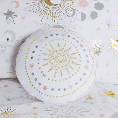 Create sweet dreams with the adorable elegance of the mi zone kids Ariella starry sky metallic printed comforter set. The girl's comforter flaunts gold metallic stars and moons that sparkle against the soft fabric, for a magical celestial look. The 2 matching shams (1 in Twin) repeat the pattern of the starry comforter and a round decorative pillow with embroidered details adds a cute finishing touch. This adorable space comforter set uses an antimicrobial treatment that provides built-in freshness protection, reducing the growth of odor causing bacteria to keep fabric lasting longer. Items in the set may come in a rolled or compressed packaging, which will need to be fluffed up or steam ironed before use to remove wrinkles.Dream away in this celestial metallic printed comforter setFeatures metallic stars and moons for a touch of sparkleSet includes comforter, 2 shams (1 in Twin), 1 decorative pillowAntimicrobial treatment helps reduce the growth of odor causing bacteria and keeps fabric lasting longerHypoallergenic polyester filling in the comforter and decorative pillowRound shaped decorative pillow has embroidery detailsItems in this set may come in rolled or compressed packaging and will need to be fluffed upSteam iron for wrinkle removalMachine wash cold, no bleach.