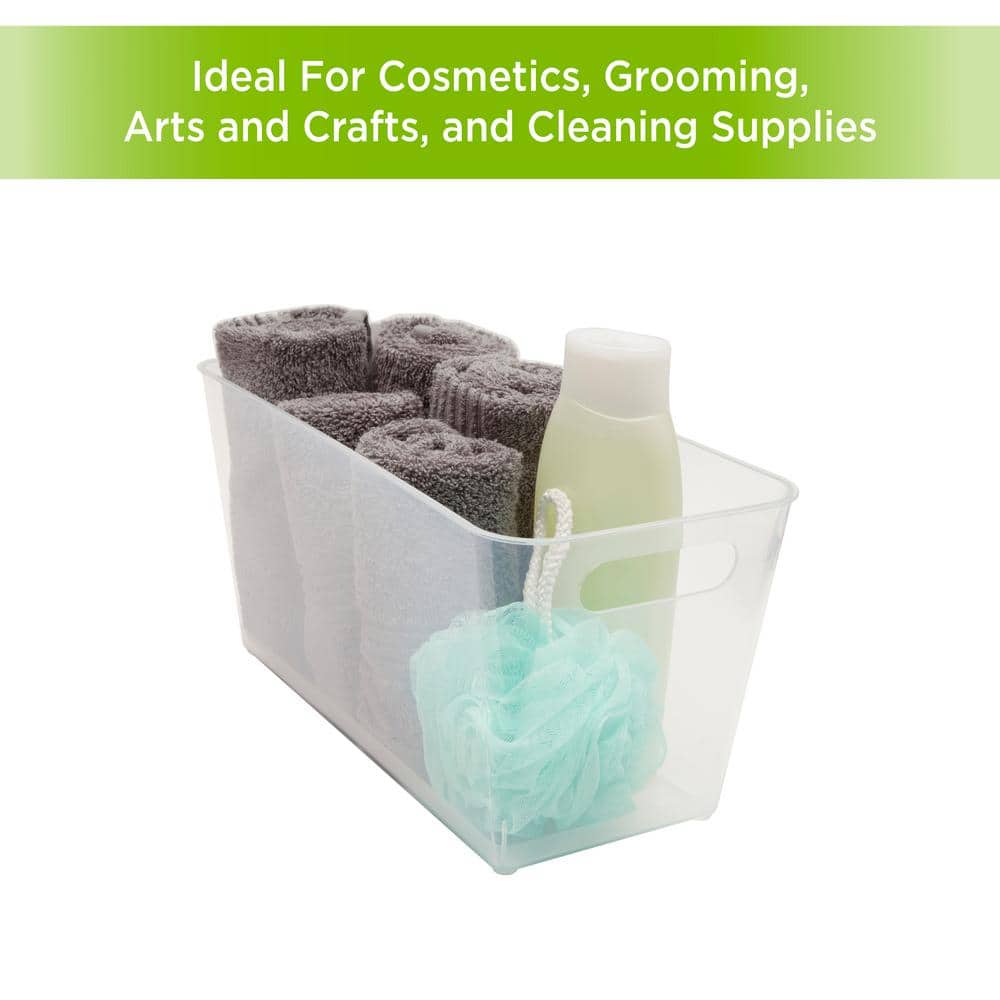 The Storage Made Simple Closet Organizer Bin is an ideal solution for storing and organizing just about everything-from toys to toiletries in your bathroom, closet, kitchen, living room, and more. They have built in handles on the side, making them easy to bring in and out of storage. Made of clear plastic, you will be able to quickly see what's in each bin from any angle. Each bin measures 7" L x 14" W x 7" H and tapers to 5.25" L x 12.25" W x 7" H. Bath Accessory Type: Cosmetic/Vanity Organizer. Color Family: Clear. Color/Finish: Clear. Material: Plastic. Mount Type: Freestanding. Number of Drawers: None. Number of Storage Compartments: 1. Product Depth (in.): 7 in. Product Height (in.): 7 in. Product Width (in.): 14.00 in.